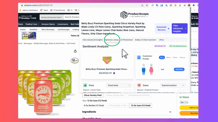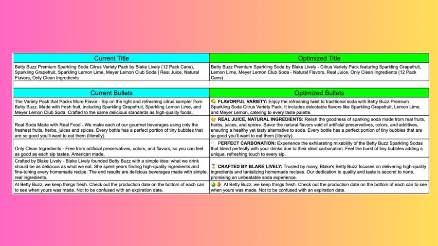 What's crazy is through my agency, FosterFBA, in the past we used to charged $200 per listing for copywriting services. Now, this tool not only slashes that cost massively, but its output eclipses our previous efforts by 2-3x, in seconds, all while resonating with your customers in their language, and aligning with their purchasing motivations effortlessly. Watch this quick walkthrough video or follow along in 3 easy steps below as I show you how we'll take our usual suspect, the Betty Buzz sparkling soda ASIN, and optimize it for conversion as a live example: